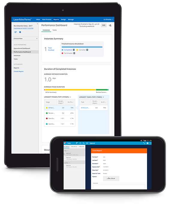Accelerate Approvals. Auto-route documents to stakeholders and gather approvals quickly by building them into your automated process. Deliver Results Faster. Speed up your return on investment by accessing prebuilt templates that are already solving problems for other Laserfiche customers. Quickly Identify Improvements. Out-of-the-box and custom analytics reports help you gather valuable insights to identify areas for improvement and inform strategic decisions. Smarter Workflows Await. With Laserfiche business process automation software, you’re only a few clicks away from dramatically improving your organizational efficiency.